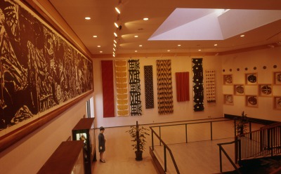 この第 1 展示室を一巡すると、スロープを通って現代民芸品が展示されている第 2、第 3 展示室へ。ここでは伝統的な技法を継承し、現代にもマッチするような壺、大皿などの陶磁器、織物、染色、竹製品、わら製品などが、それぞれの地方色を出して展示されていた。