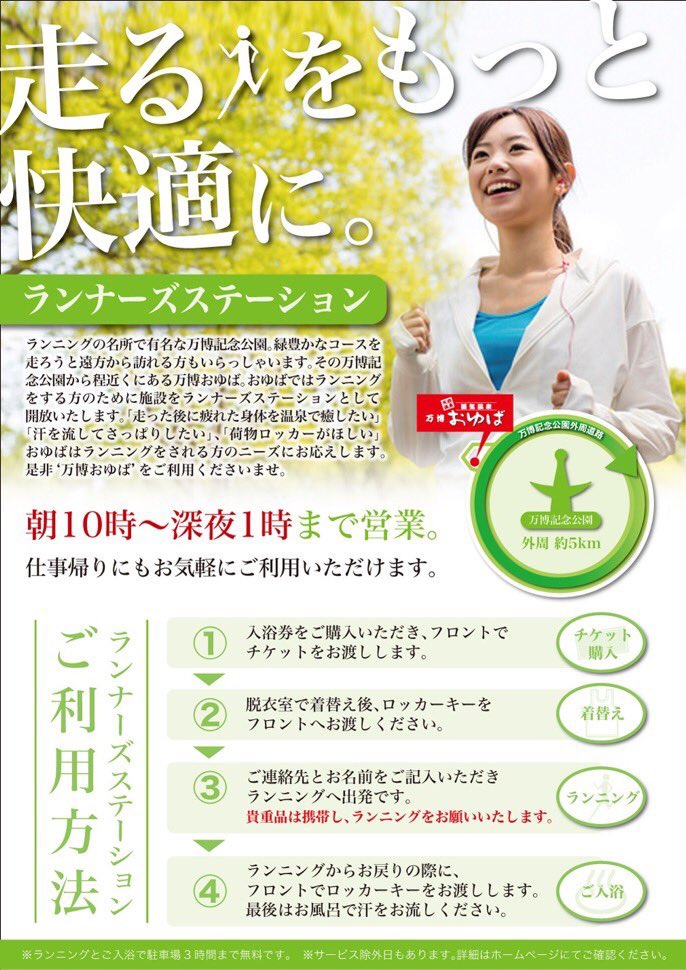 「万博おゆば」ではランニングをする方のために、施設をランナーズステーションとして開放しております。